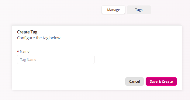 From the left slide out panel, click Organisation icon to open the page where you can manage the list of organisations. At the top of the screen there is a Tag option, clicking this will take you to the screen for all the tags where you can click Create Tag to add more custom labels.