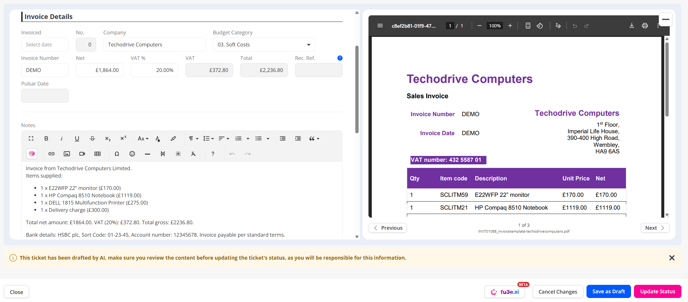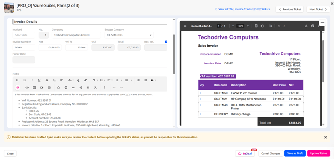3. Once you click create in this pop-up, the fu3e.ai slide out will then open to show the ticket/s being generated, click view to open the split-screen so that you can compare the file information against the generated information from the AI.